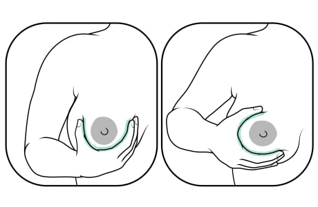 - C hold: Your thumb is above the darker area around the nipple (areola). Your fingers are below.