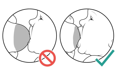 Make sure that your nipple and much of your areola are in your baby's mouth. Your baby's lips are flared out, not folded in.