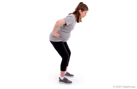 - Slowly bend forward, allowing your arms to hang down. Lean only as far as you can without feeling discomfort or pressure on your belly.