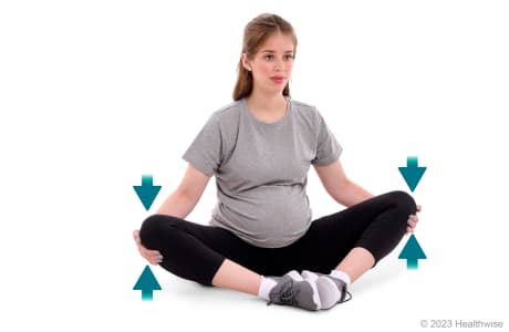 - Press your knees toward the floor. At the same time, resist that force by pulling upward with your hands.