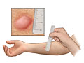 For a tuberculin skin test, you sit down and turn the inner side of your forearm up. The skin where the test is done is cleaned and allowed to dry. A small shot of the tuberculosis antigen (purified protein derivative, or PPD) is put under the top layer of skin. The fluid makes a little bump (wheal) under the skin. A circle may be drawn around the test area with a pen.